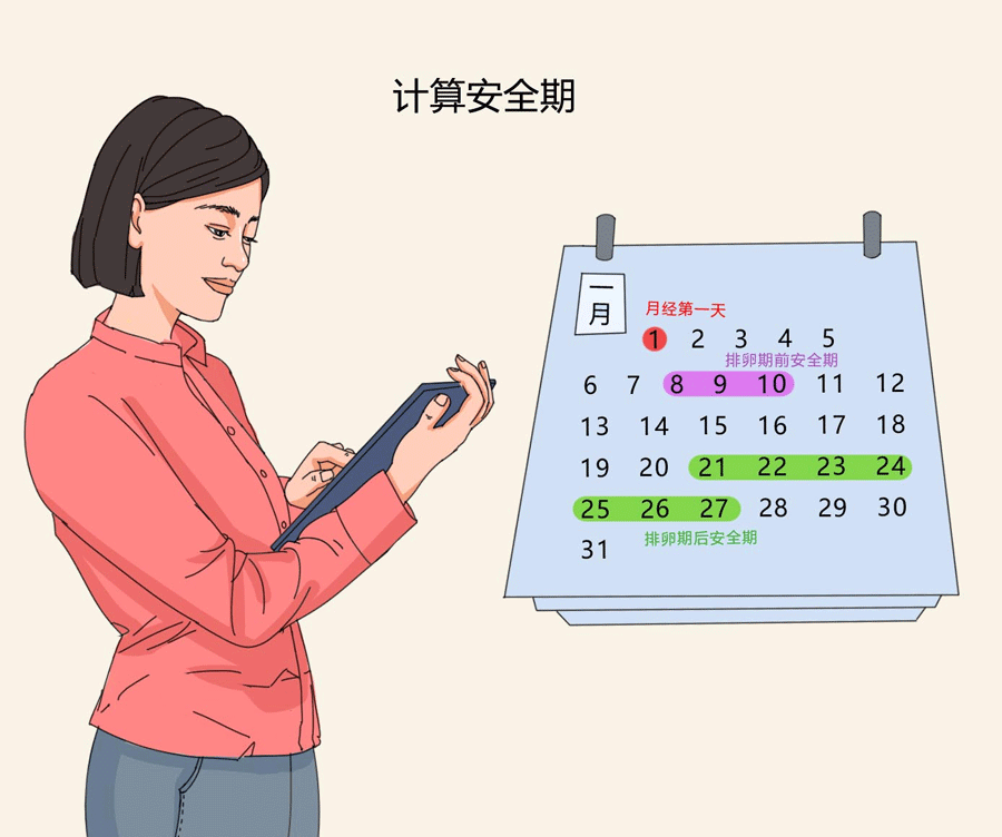从下次月经来潮的第1天算起,倒数14天或减去14天就是排卵日,排卵日及其前5天和后4天加在一起称为排卵期,而在月经周期中,除了月经期和排卵期,剩下的就是安全期。