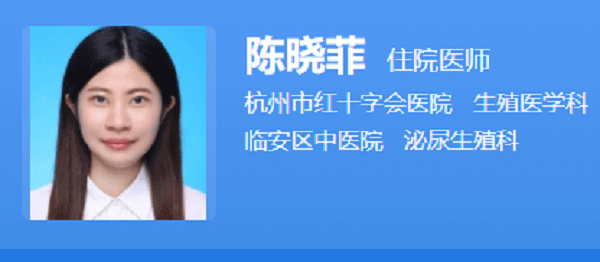 陈晓菲,杭州市红十字会医院生殖医学科住院医师,毕业于浙江中医药大学,硕士学位,师从浙江省杏林工程领军人才——省级名中医丁彩飞教授。