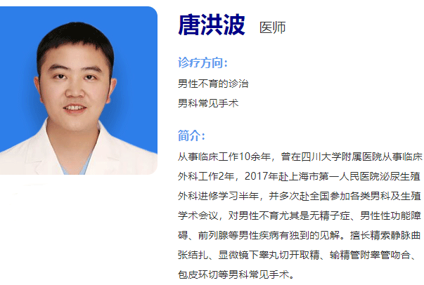 唐洪波,成都西囡妇科医院男科医师,从事临床工作10余年,曾在四川大学附属医院从事临床外科工作2年,2017年赴上海市第一人民医院泌尿生殖外科进修学习半年。