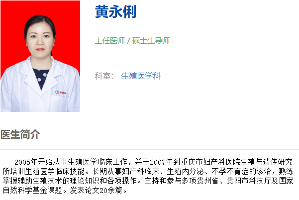 黄永俐,贵州医科大学附属医院生殖中心主任医师,教授。1998年毕业于贵阳医学院。从事妇科内分泌、优生遗传、不孕症及辅助生殖技术的研究及诊断治疗工作,具有坚实的医学理论基础和丰富的临床医学实践经验。